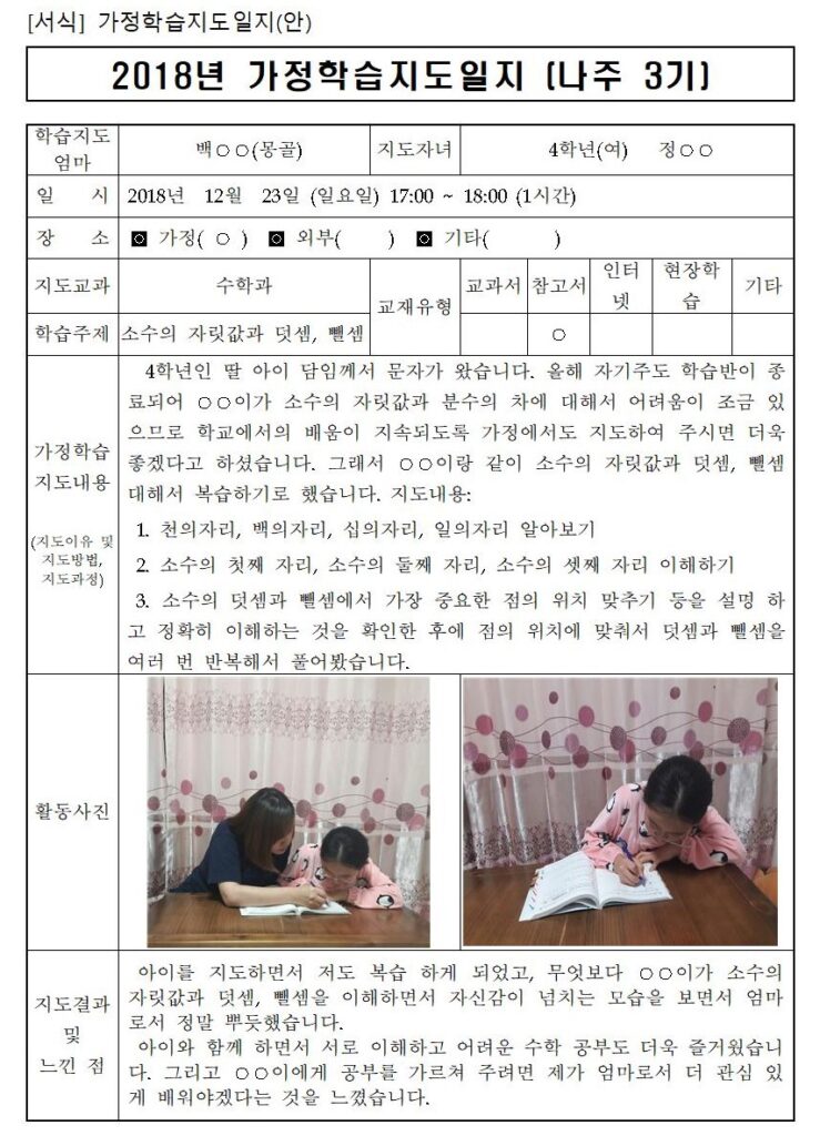 • 엄마학교 졸업 후, 매주 1회 이상 가정에서 자녀를 직접 학습지도하고, ‘지도일지‘를 제출